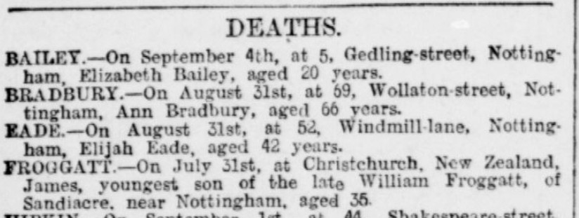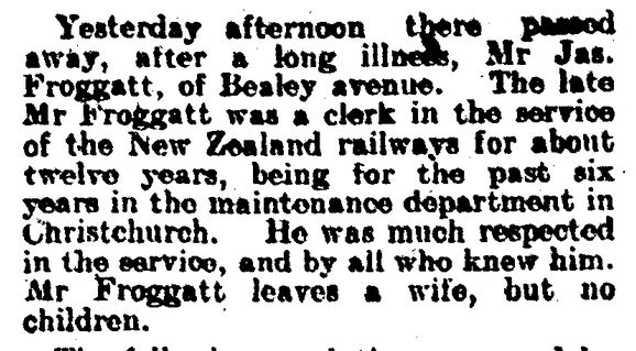 The Children of Sarah and William FROGGATTWilliam FROGGATT (1869-1946)William was born 10 January 1869 at Sandiacre, the first child of William and Sarah. He grew up in Sandiacre, was well educated, including having a private tutor - William Whitehead - and a time at the nearby Risley Latin School. But William struggled after his father died in 1881. He was caught throwing sticks into the chestnut trees of a local landowner, and was reputed to have cut the head off a topiary rooster. When he was just 16 years old he was on a ship bound for Australia where he could start a new life. It is unknown whether he chose to go or was coerced or whether his fare was paid out of his future inheritance, but he was followed a year later by his brother James, suggesting both chose to go. William had an interesting life in the colonies (Australia and New Zealand) married twice and had 14 children. There is more about the life of William Froggatt (my grandfather) here.James FROGGATT (1870-1905)James was born early 1870 at Sandiacre. He does not appear to have been baptised, either in the Baptist, Methodist or CofE churches. When he was 16 years old he too boarded a ship for Australia, arriving in Melbourne in May 1887. He appears to have found a job with the railways but soon left and moved to Christchurch, New Zealand, where he again joined the railways. Here he met Louisa Adele SHARPE. When James was posted to the small town of Waipukurau in Hawkes Bay, He was joined there by Louisa and they married on 6 February 1894 at the local St Mary's Church. James and Louisa returned to Christchurch, but James had contracted tuberculosis (he may well have been infected in England before he left) and he died in Christchurch on 28 July 1905. He is buried at Linwood Cemetery, along with his wife Louisa and mother-in-law Elizabeth SHARPE (née MARSDEN). James and Louisa did not have any children. In 1897 James had made a Will, leaving his entire estate to his wife Louisa. This included the proceeds of two life insurance policies.