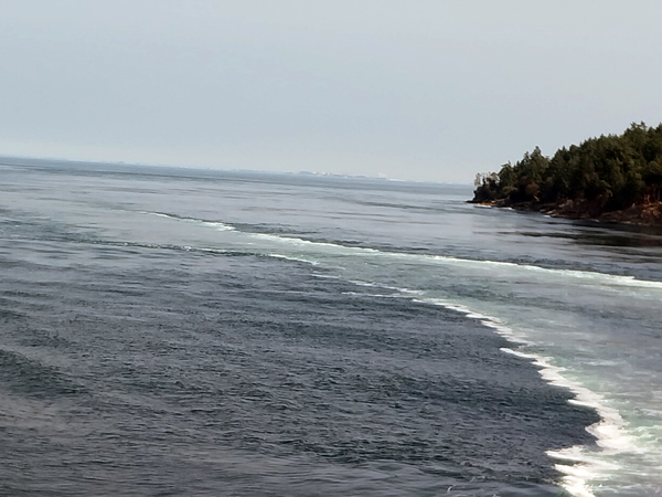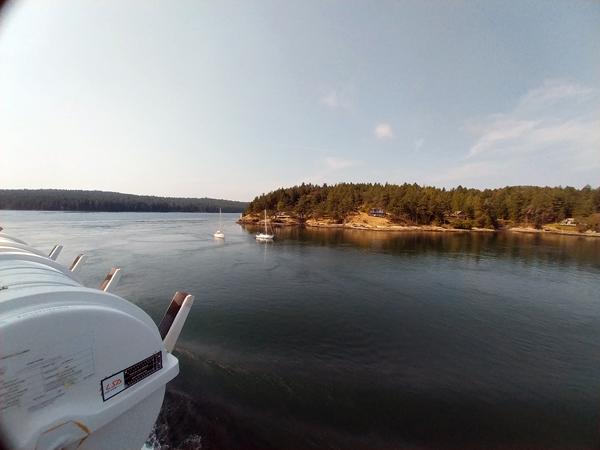 The ferry departs from Tsawwassen, where the long pier almost crosses over into United States territory. The ferry sails southwest across a small part of Washington, then enters