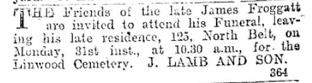The Children of Sarah and William FROGGATTWilliam FROGGATT (1869-1946)William was born 10 January 1869 at Sandiacre, the first child of William and Sarah. He grew up in Sandiacre, was well educated, including having a private tutor - William Whitehead - and a time at the nearby Risley Latin School. But William struggled after his father died in 1881. He was caught throwing sticks into the chestnut trees of a local landowner, and was reputed to have cut the head off a topiary rooster. When he was just 16 years old he was on a ship bound for Australia where he could start a new life. It is unknown whether he chose to go or was coerced or whether his fare was paid out of his future inheritance, but he was followed a year later by his brother James, suggesting both chose to go. William had an interesting life in the colonies (Australia and New Zealand) married twice and had 14 children. There is more about the life of William Froggatt (my grandfather) here.James FROGGATT (1870-1905)James was born early 1870 at Sandiacre. He does not appear to have been baptised, either in the Baptist, Methodist or CofE churches. When he was 16 years old he too boarded a ship for Australia, arriving in Melbourne in May 1887. He appears to have found a job with the railways but soon left and moved to Christchurch, New Zealand, where he again joined the railways. Here he met Louisa Adele SHARPE. When James was posted to the small town of Waipukurau in Hawkes Bay, He was joined there by Louisa and they married on 6 February 1894 at the local St Mary's Church. James and Louisa returned to Christchurch, but James had contracted tuberculosis (he may well have been infected in England before he left) and he died in Christchurch on 28 July 1905. He is buried at Linwood Cemetery, along with his wife Louisa and mother-in-law Elizabeth SHARPE (née MARSDEN). James and Louisa did not have any children. In 1897 James had made a Will, leaving his entire estate to his wife Louisa. This included the proceeds of two life insurance policies.