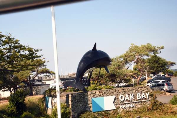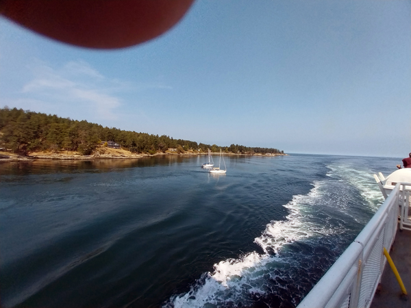 The ferry departs from Tsawwassen, where the long pier almost crosses over into United States territory. The ferry sails southwest across a small part of Washington, then enters